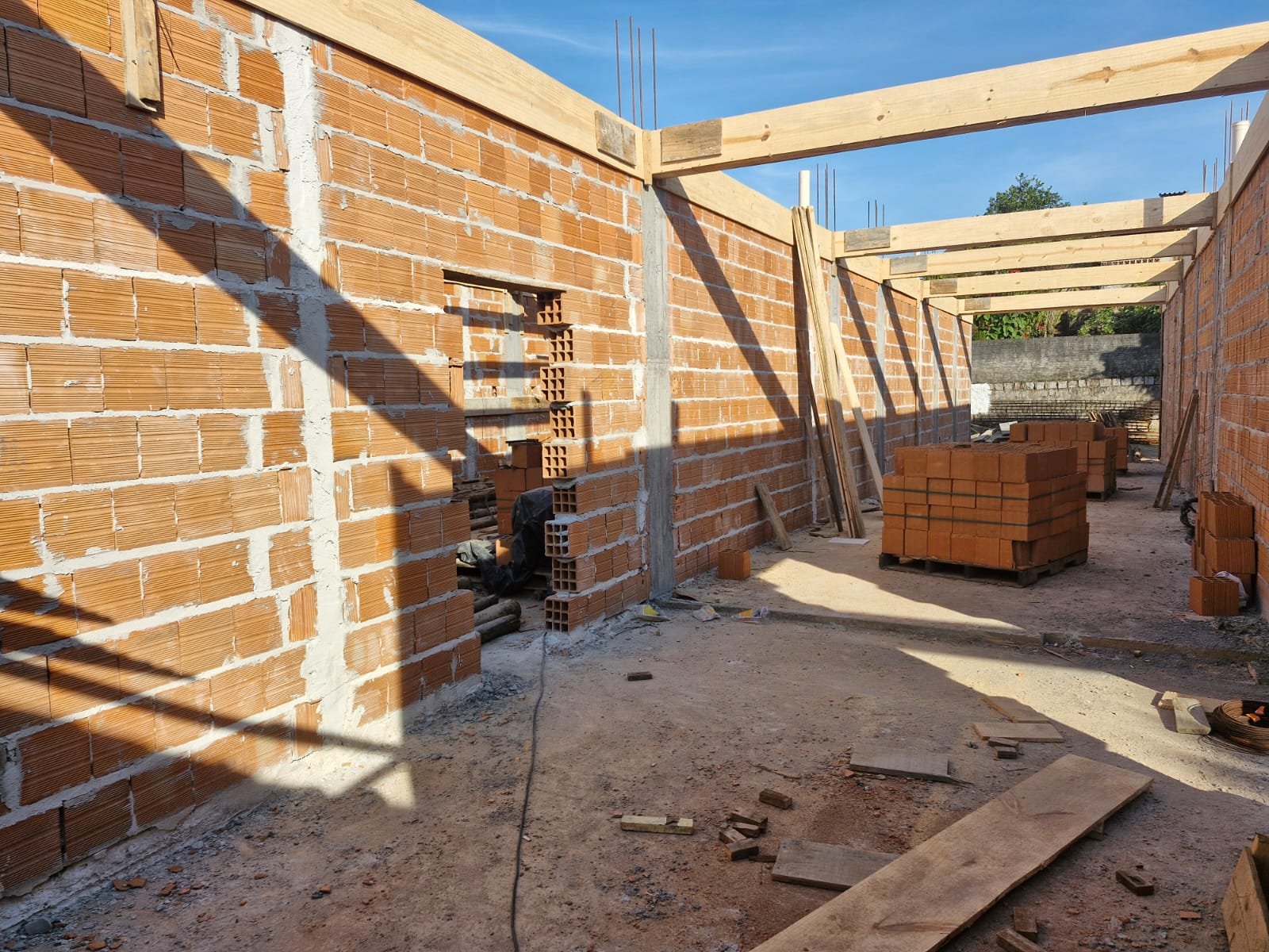 A alvenaria é a fase em que se constroem as paredes do imóvel, utilizando blocos de concreto, assentados com argamassa. Ela define os ambientes da casa, como quartos, sala e banheiros.